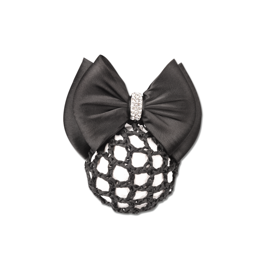 Κομψό δίχτυ-κλιπ με φιόγκο διακοσμημένο με ένα μικρό δαχτυλίδι σε ασημί χρώμα γεμάτο με στρας.