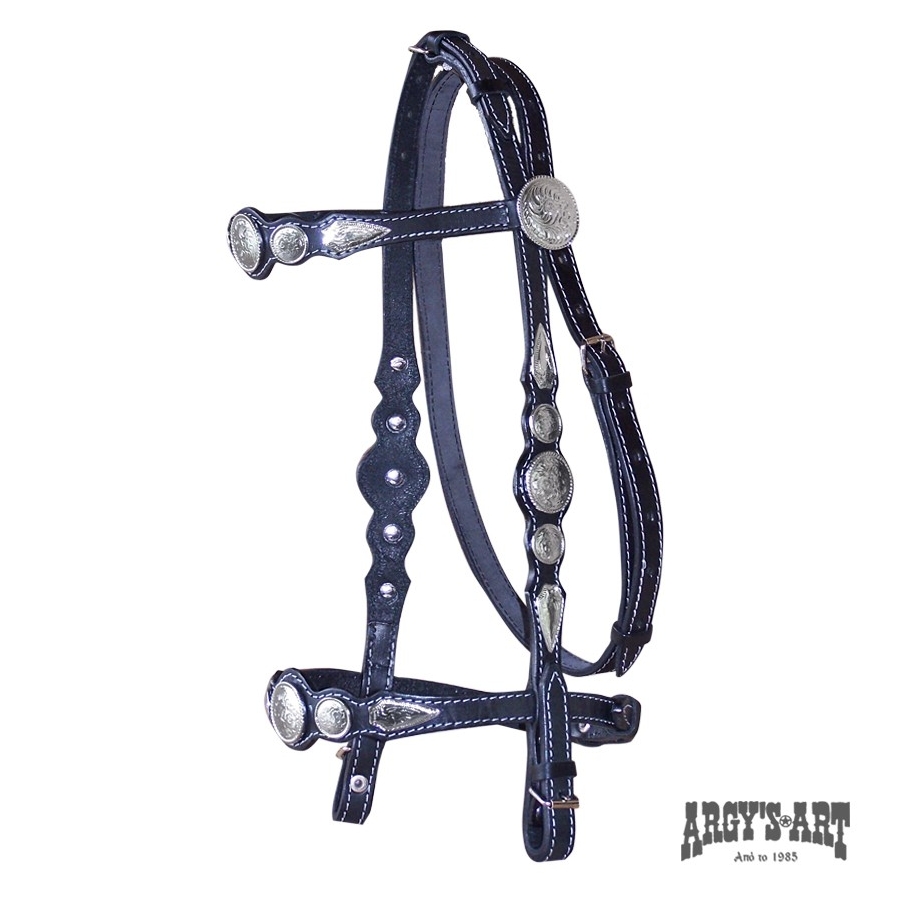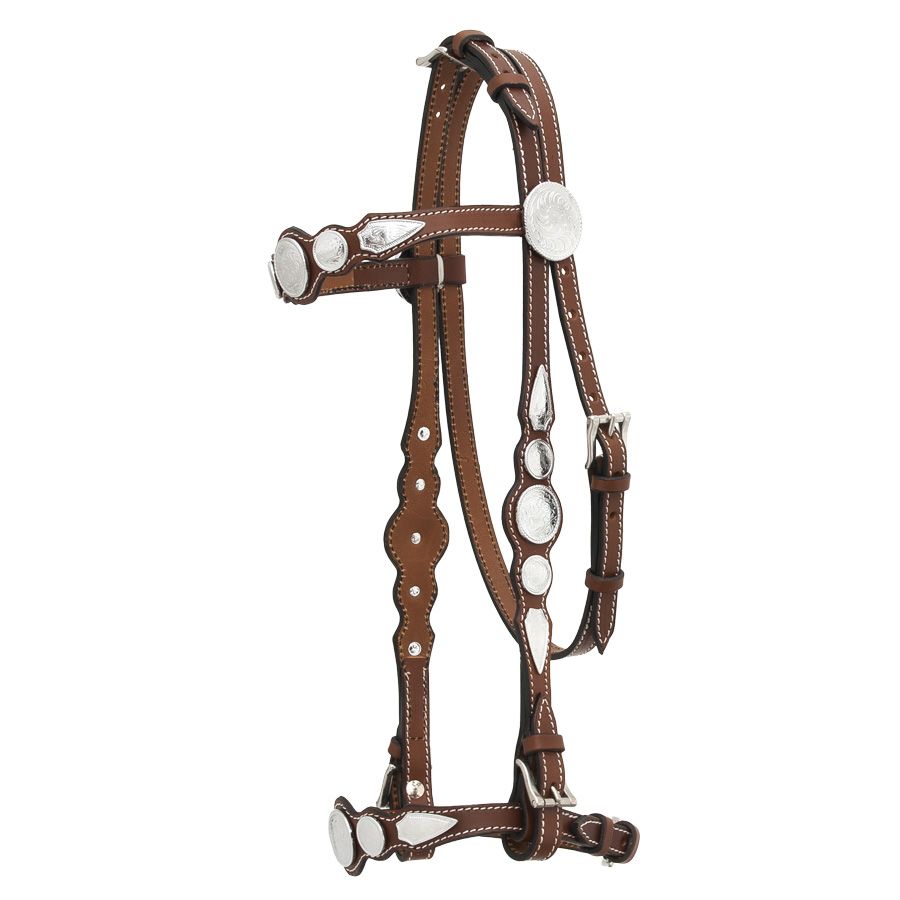 Χαλινό western κατασκευασμένο από την καλύτερη ποιότητα δέρματος μόσχου 5mm πάχος και επιρρύνιο για την καλύτερη σταθερότητα της στομίδας. Διακοσμημένο με μεταλλικά επιχρωμιωμένα διακοσμητικά και περιμετρική ραφή από άσπρη κλωστή. Όλες οι αγκράφες είναι από ανοξείδωτο ατσάλι.