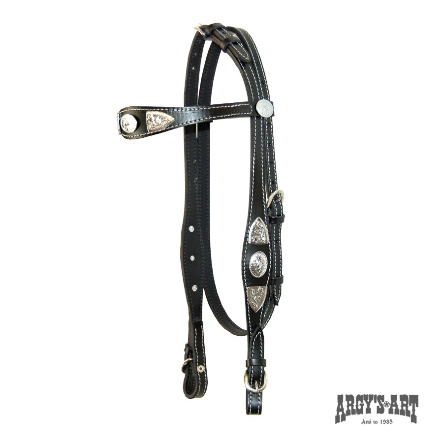 Χειροποίητο χαλινό Western Argy’s Art, κατασκευασμένο από δέρμα μοσχάρι 5mm πάχος. Περιμετρική διακόσμηση από άσπρη κλωστή και επιχρωμιωμένα μεταλλικά διακοσμητικά. Όλες οι αγκράφες είναι από ανοξείδωτο ατσάλι. Συμπεριλαμβάνονται και απλά ηνία.