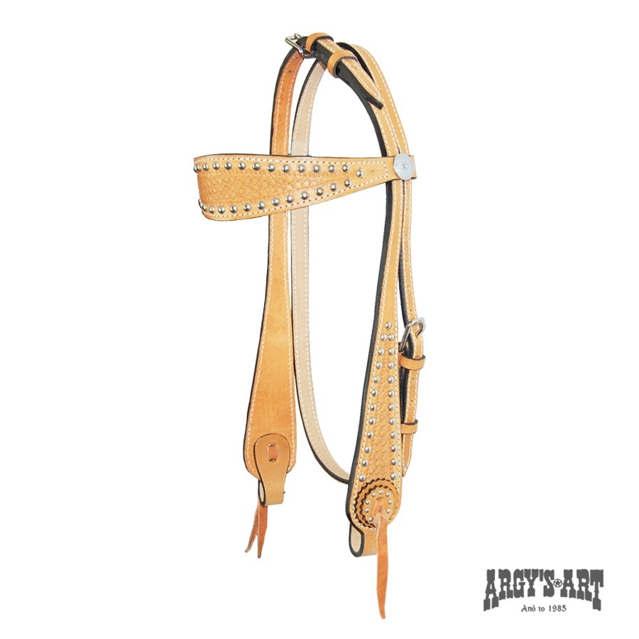 Χειροποίητο χαλινό, κατασκευασμένο από δέρμα μοσχάρι 5mm πάχος, με φαρδιά επιμετωπίδα. Διακοσμημένο με πλούσιο σκάλισμα στο χέρι και μεταλλικά διακοσμητικά. Όλες του οι αγκράφες είναι από ανοξείδωτο ατσάλι και το κλείσιμο στη στομίδα με δερμάτινα κορδόνια.