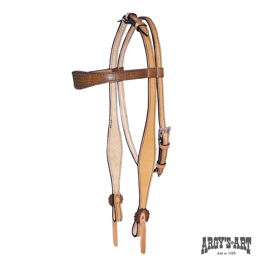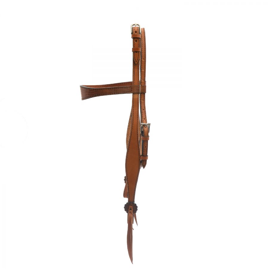 Χειροποίητο χαλινό, κατασκευασμένο από δέρμα μοσχάρι 5mm πάχος, με φαρδιά επιμετωπίδα από όμορφο σκούρο δέρμα και κλείσιμο στη στομίδα με δερμάτινα κορδόνια.