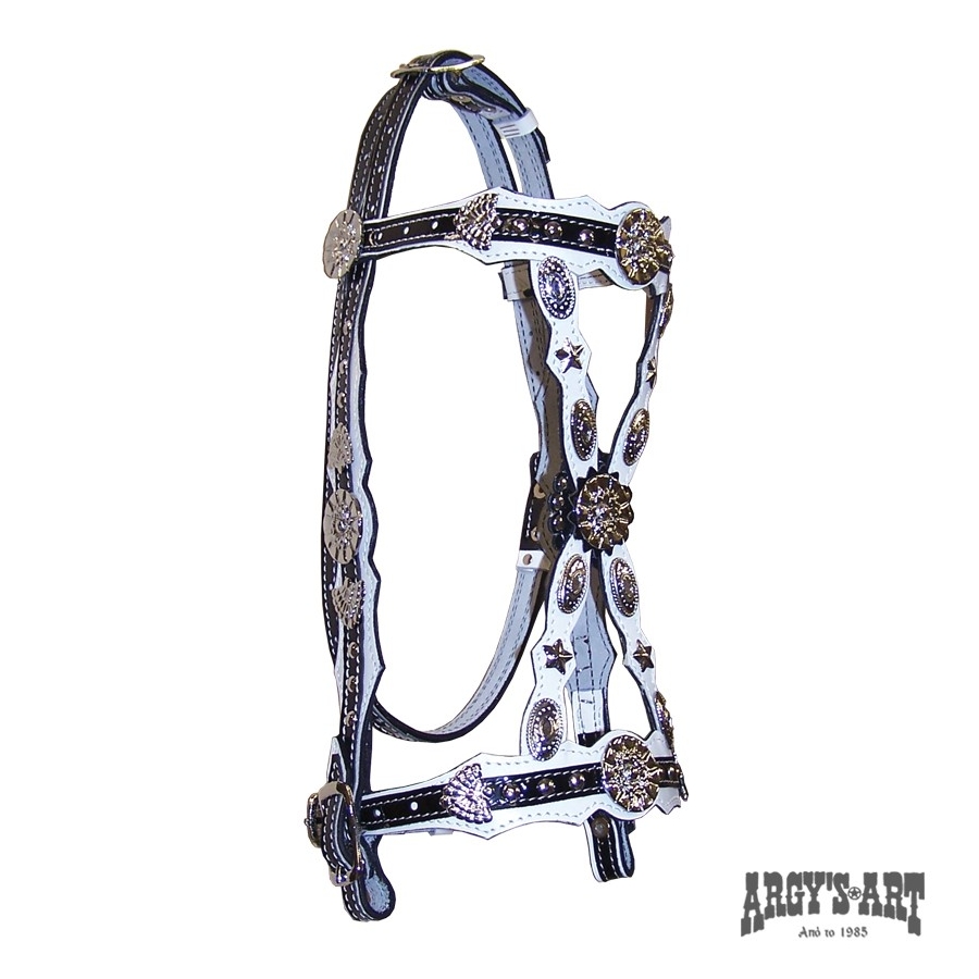 Χαλινό από διπλό δέρμα μοσχάρι αδιάβροχης βαφής. Φτιαγμένο όλο σε διχρωμία και διακοσμημένο με μεταλλικά επιχρωμιωμένα διακοσμητικά, όπως και τα ηνία. Ταιριάζει με όλες τις δίχρωμες σέλες Argy’s Art, και μπορεί να παραχθεί σε πολλούς χρωματικούς συνδυασμούς.