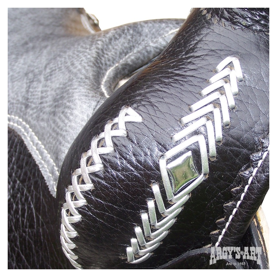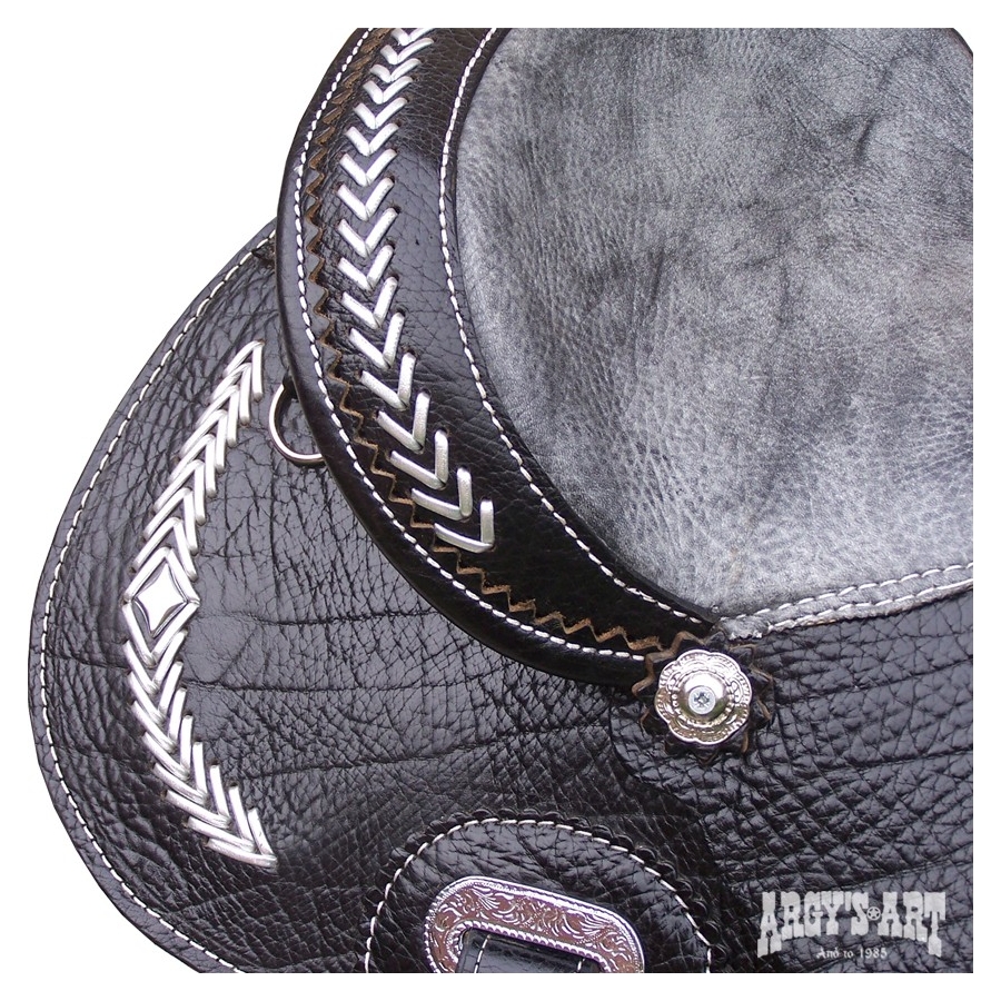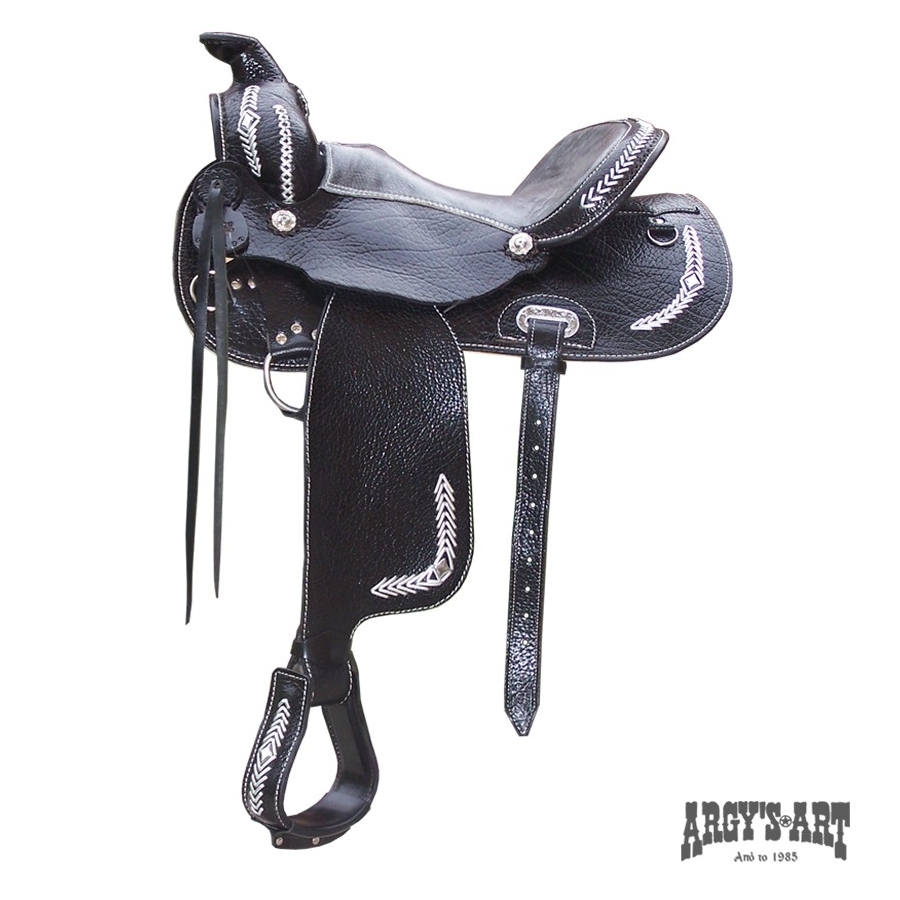 Η σέλα είναι διακοσμημένη με πλέξη «ψαροκόκαλο» από ασημί κορδόνι και επιχρωμιωμένα μεταλλικά διακοσμητικά. Επίσης διαθέτει κρίκους από ανοξείδωτο ατσάλι και ενίσχυση στο δεύτερο έποχο.