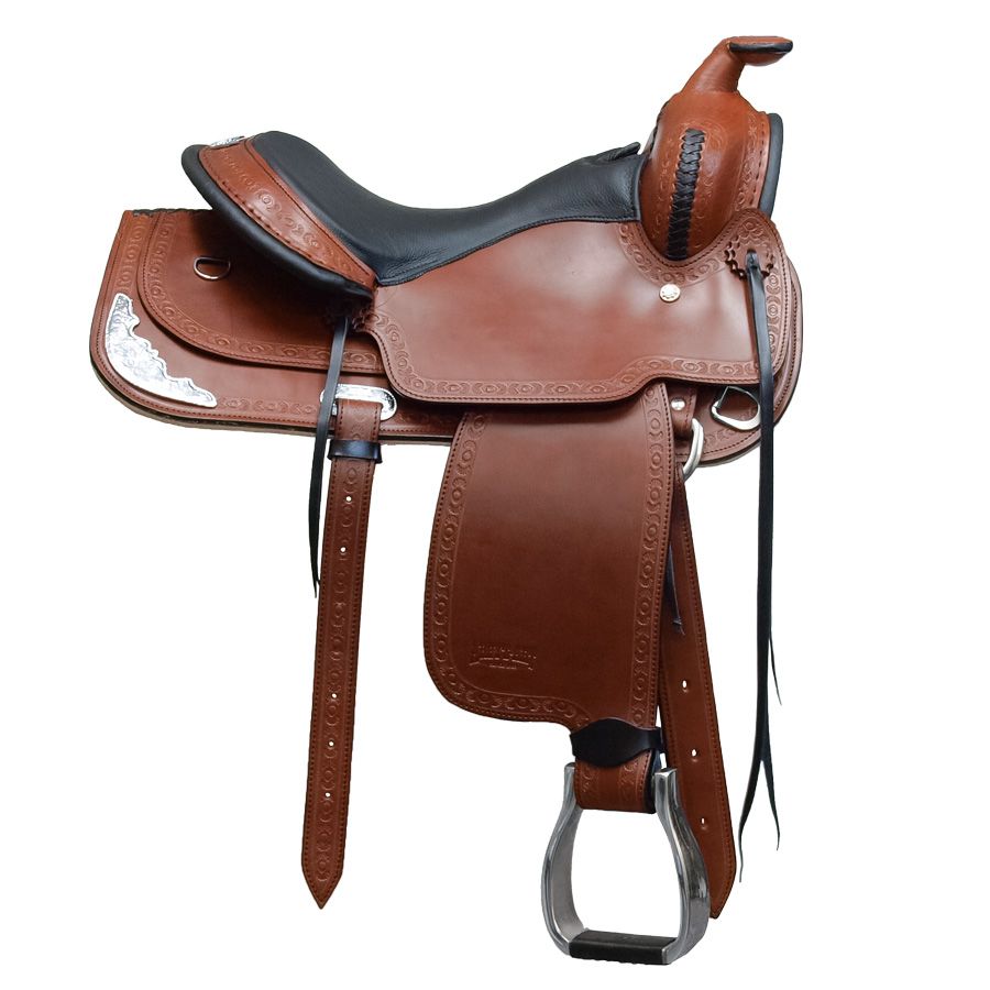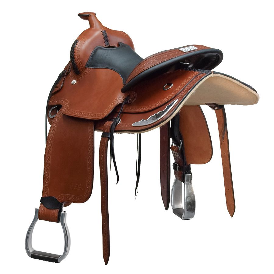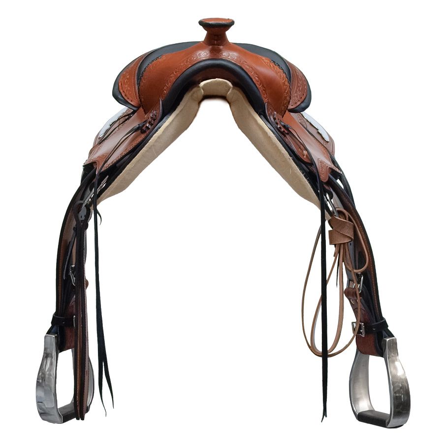 Χειροποίητη σέλα κατασκευασμένη από γνήσιο δέρμα μοσχαριού. Σε κλασικό western σχεδιασμό, με κέρατο μπροστά, αναπαυτικό κάθισμα για τον αναβάτη, western αναβολείς, λουριά για πρώτο και δεύτερο έποχο και κρίκους πρόσδεσης για επιστήθιο και υπονούριο. Διαθέτει επιπλέον κρίκους για τοποθέτηση σακιδίων και παγουριών.