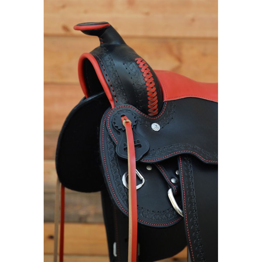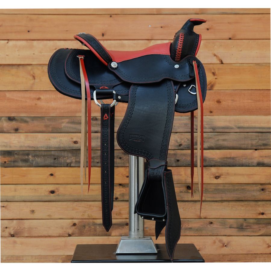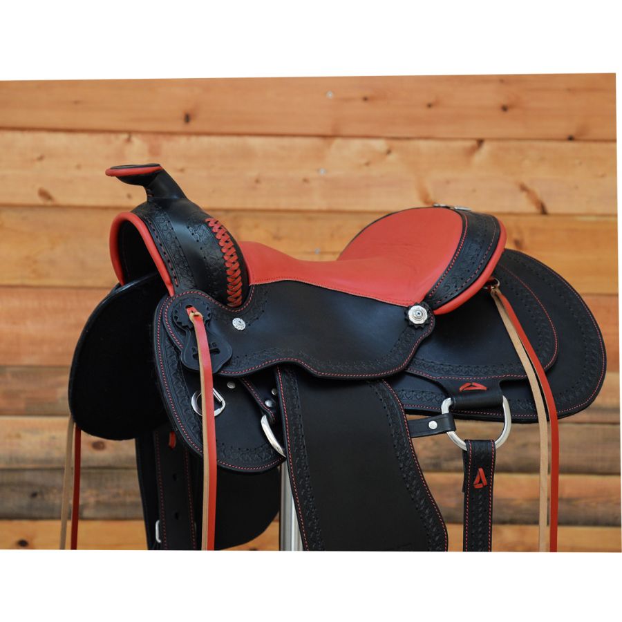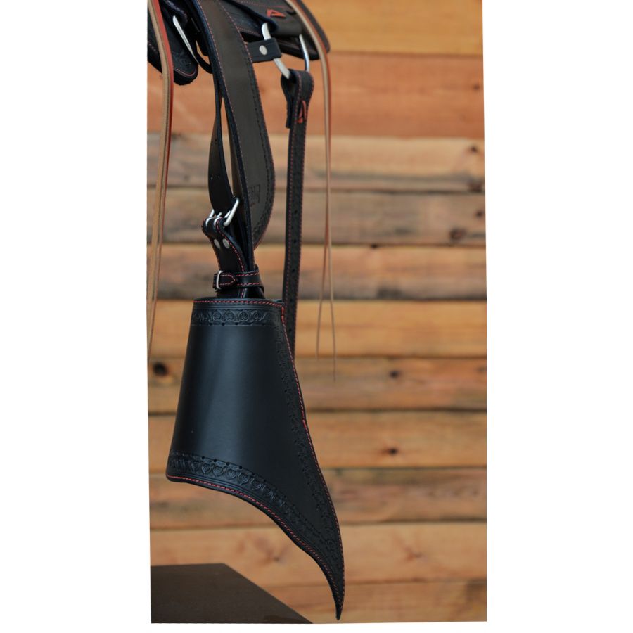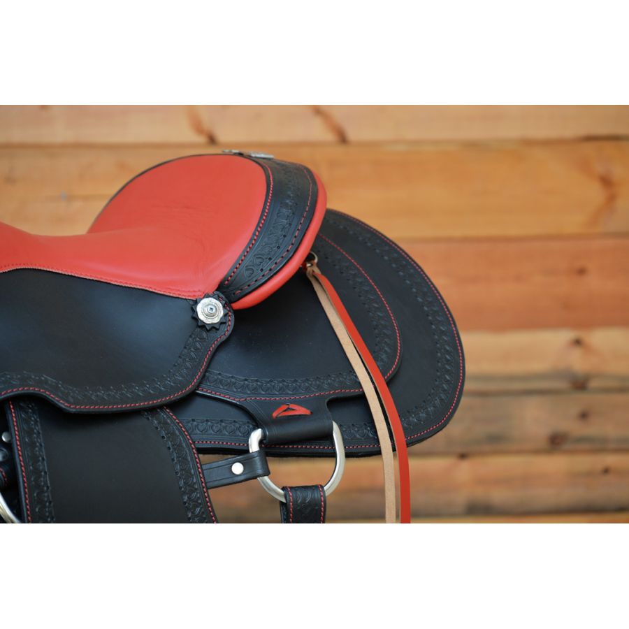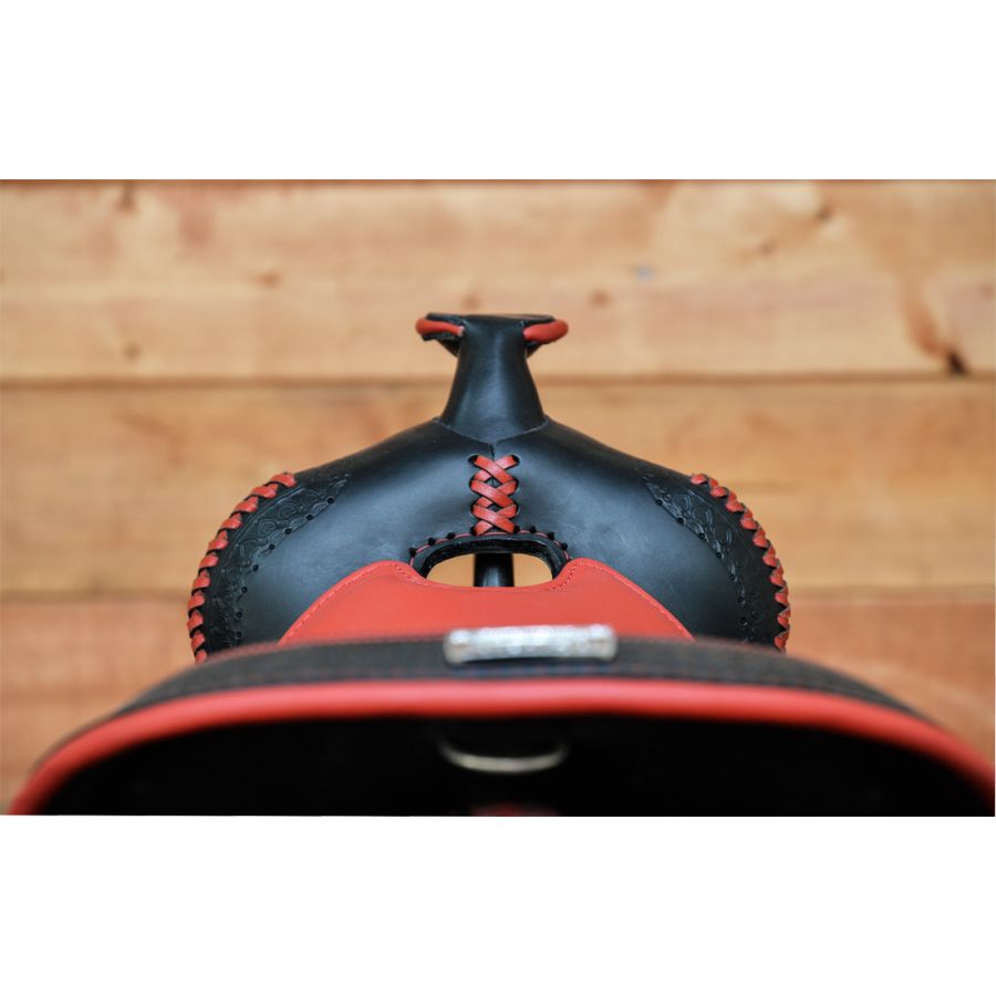 Χειροποίητη σέλα κατασκευασμένη από γνήσιο δέρμα μοσχαριού. Ένα σαγηνευτικό αριστούργημα που συνδυάζει τη διαχρονική κομψότητα με μια πινελιά σύγχρονης αισθητικής. Το μαύρο δέρμα σε συνδυασμό με το κόκκινο κάθισμα και το σκάλισμα στο χέρι, προσφέρει ένα πλούσιο και λαμπερό αποτέλεσμα. Το μαλακό κάθισμα εξασφαλίζει ασφαλή και άνετη εφαρμογή, προάγοντας μια φυσική θέση ίππευσης, μειώνοντας την κούραση στις μεγάλες διαδρομές.