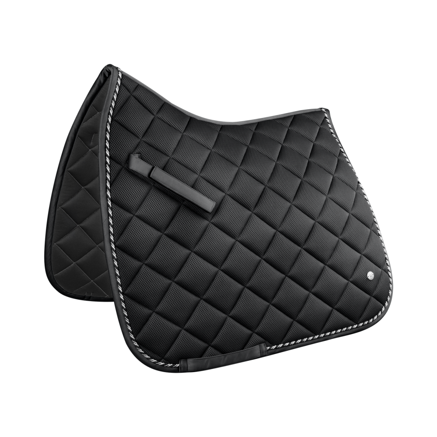 Υπόσαγμα κατάλληλο για dressage, με διχτυωτό υλικό που παρέχει μέγιστη διαπνοή και καρό σχεδιασμό. Στρογγυλεμένες άκρες, τρίχρωμο κορδόνι καθώς και ασημί μεταλλική πλάκα με το λογότυπο.