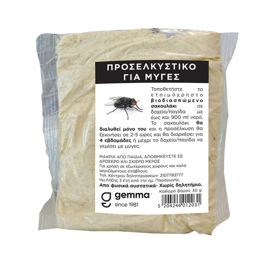 Ειδική σκόνη που διαλύεται σε νερό για την προσέλκυση μυγών. Χωρίς χημικές ουσίες, μη τοξικό. Κατάλληλο για όλα τα είδη εντομοπαγίδων. Γεμίστε οποιαδήποτε δολωματική παγίδα με νερό (έως 900 ml), τοποθετήστε το βιοδιασπώμενο σακουλάκι των 30 g και ανακατέψτε με ένα ξυλάκι. Η προσέλκυση θα ξεκινήσει σε περίπου 4 ώρες.