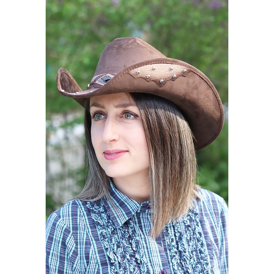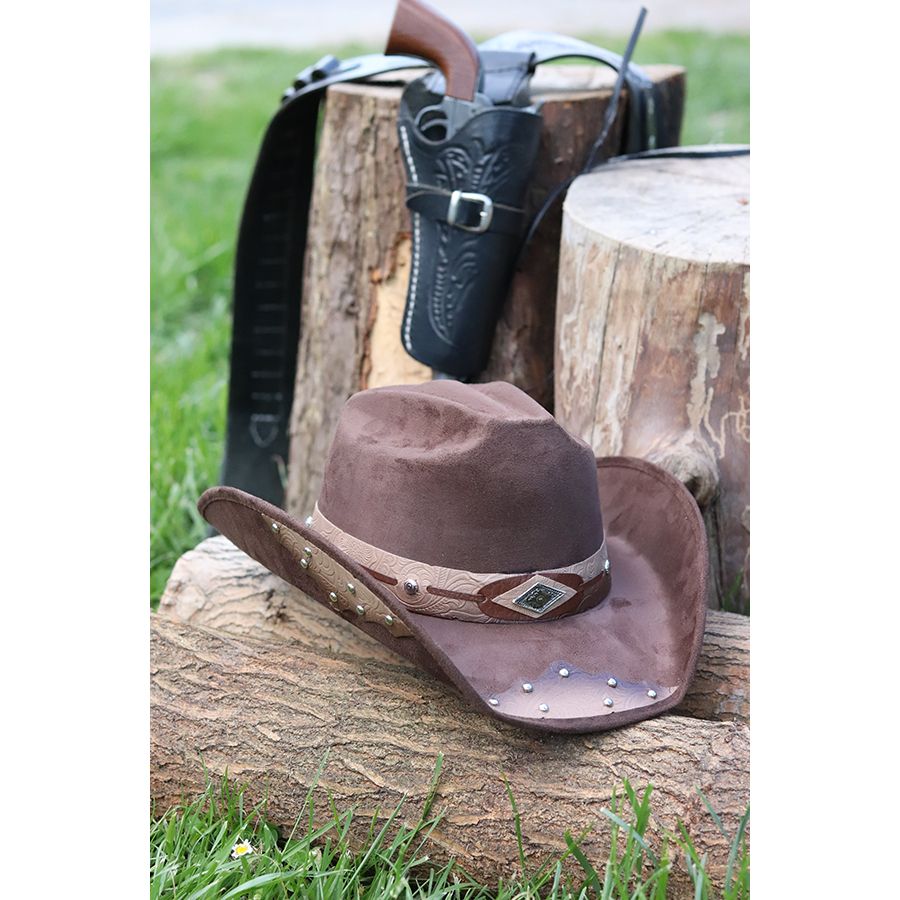 Ξεχωριστό καπέλο Western, τύπου suede, με φαρδιά λωρίδα δύο αποχρώσεων από τεχνόδερμα, διακοσμημένη με μεταλλικά διακοσμητικά και τρουκς.