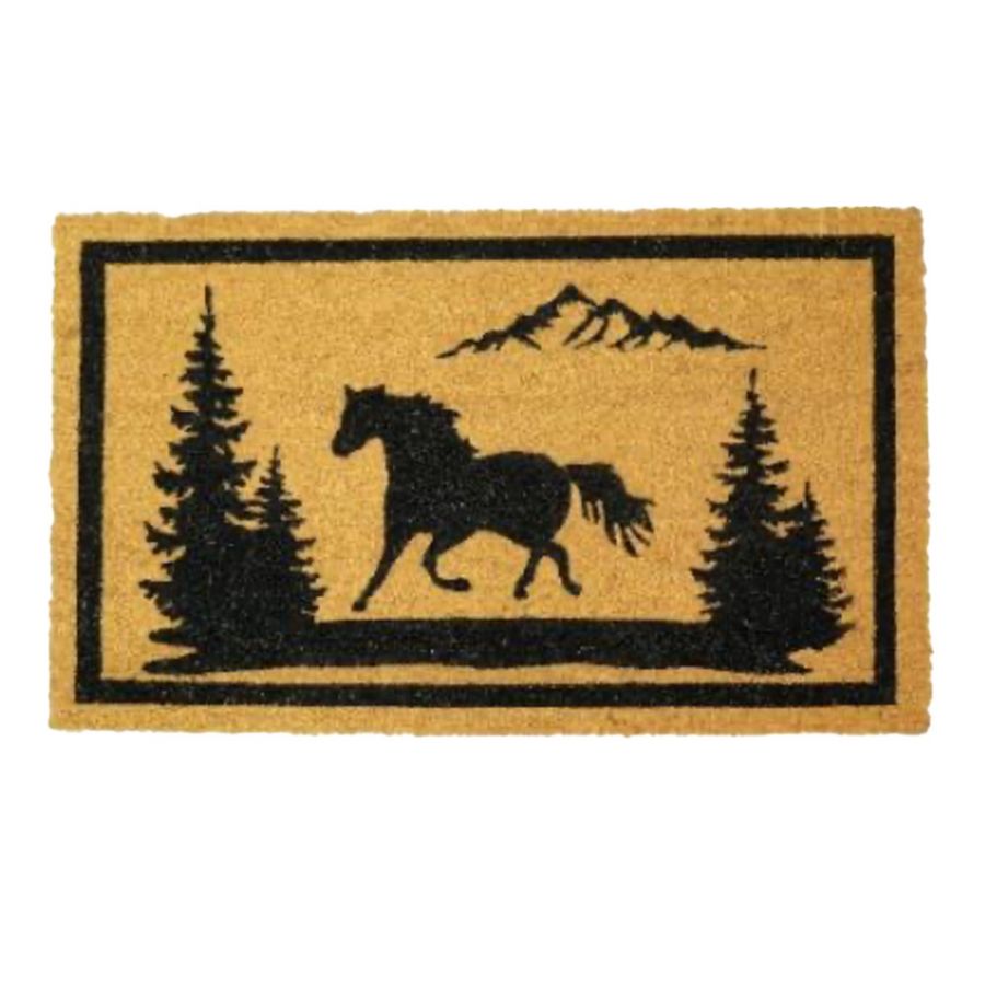 Πολύ γερό και ανθεκτικό χαλάκι εξώπορτας από ίνες κοκοφοίνικα. Απεικόνιση αδάμαστου αλόγου στα δάση της Αμερικής!