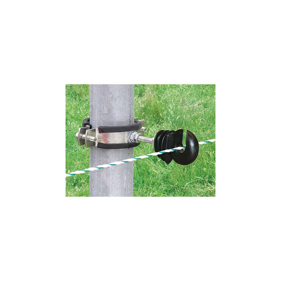 Αντάπτορας-βάση για την τοποθέτηση μονωτήρα σε σιδερένια σωλήνα ή τσιμεντένιο στύλο. Πρόκειται για ένα δακτύλιο από γαλβανισμένο ατσάλι που τοποθετείται στη σωλήνα και επιτρέπει την τοποθέτηση μονωτήρα με σπείρωμα, χωρίς να ανοιχτούν τρύπες στη σωλήνα. Με αυτό τον τρόπο οποιαδήποτε μετατροπή στη περίφραξη (αλλαγή ύψους, προσθήκη ή αφαίρεση γραμμών) εύκολα και γρήγορα, χωρίς μόνιμη αλλοίωση της σωλήνας. Κατάλληλο για σωλήνες με διάμετρο 35-70mm. Είναι επενδυμένο με λάστιχο για σταθερή εφαρμογή και για προστασία της σωλήνα από γρατζουνιές. Στην οπή μπορείτε να προσαρμόσετε οποιοδήποτε μονωτήρα με μετρικό σπείρωμα Μ6.