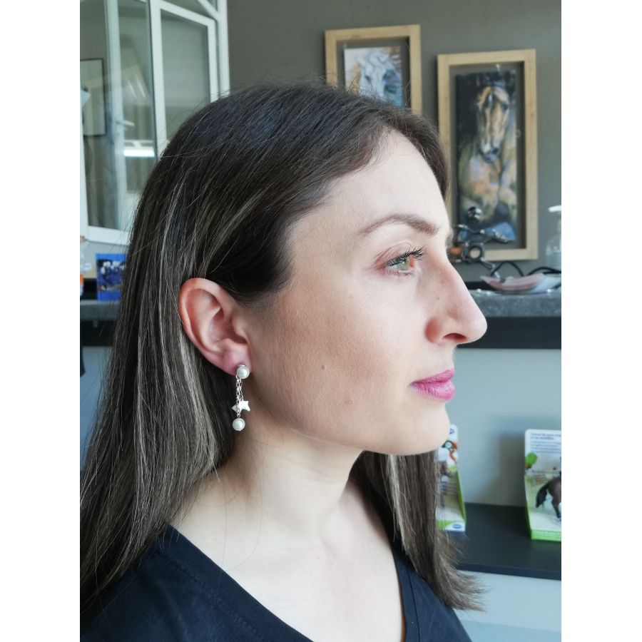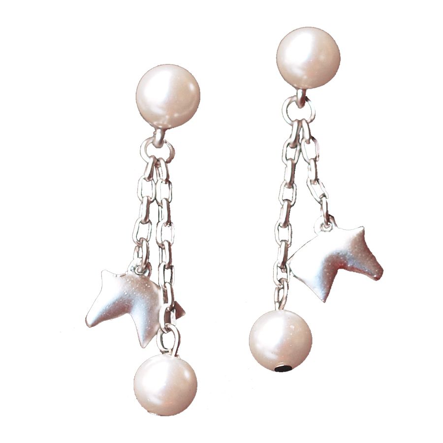 Κρεμαστά σκουλαρίκια με λευκές πέρλες και κεφάλι αλόγου σε διπλή αλυσίδα. Το κούμπωμα είναι υποαλλεργικό.