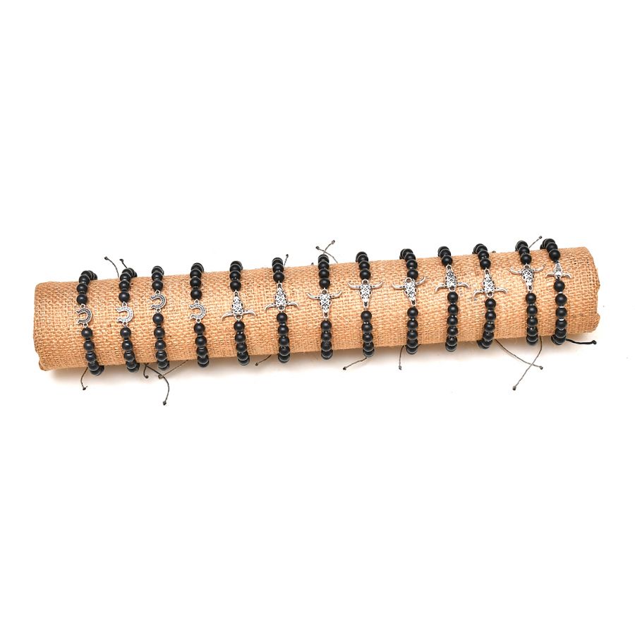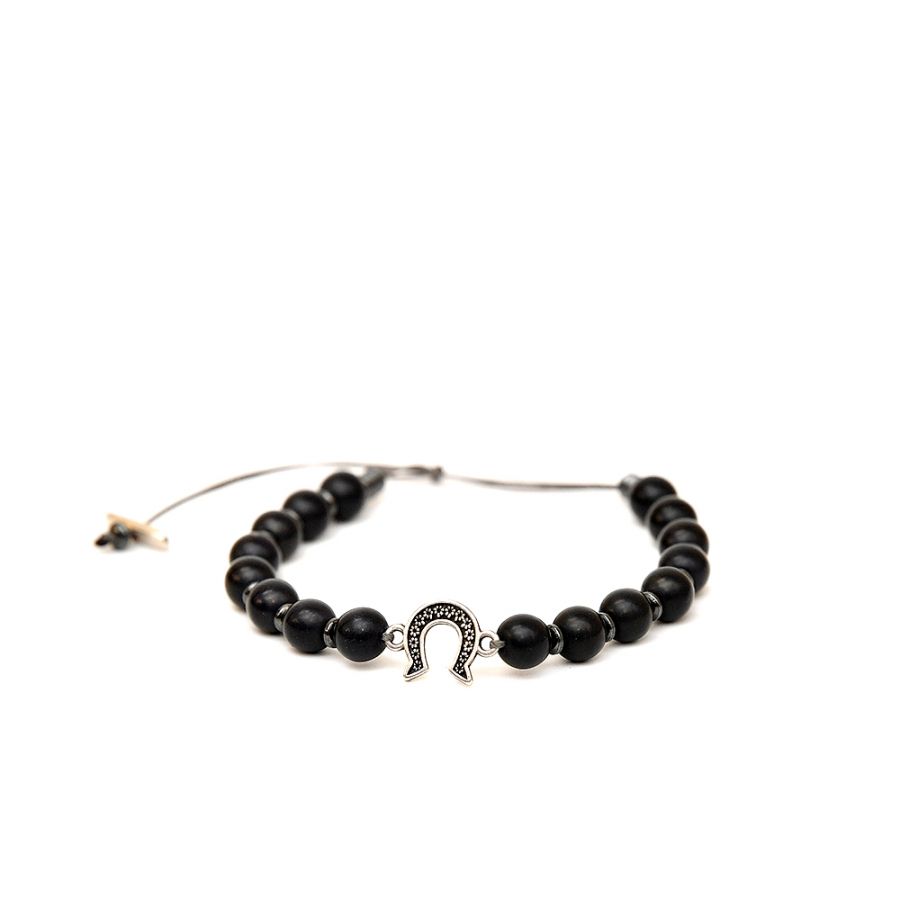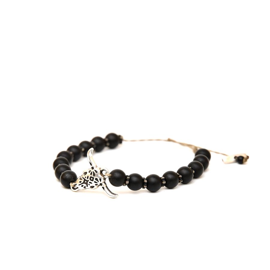 Βραχιόλι με κεφάλι ταύρου/πέταλο με χοντρή χάντρα σε μαύρο χρώμα. Το μέγεθος αυξομειώνεται χάρη στο μακραμέ πλέξιμο του.