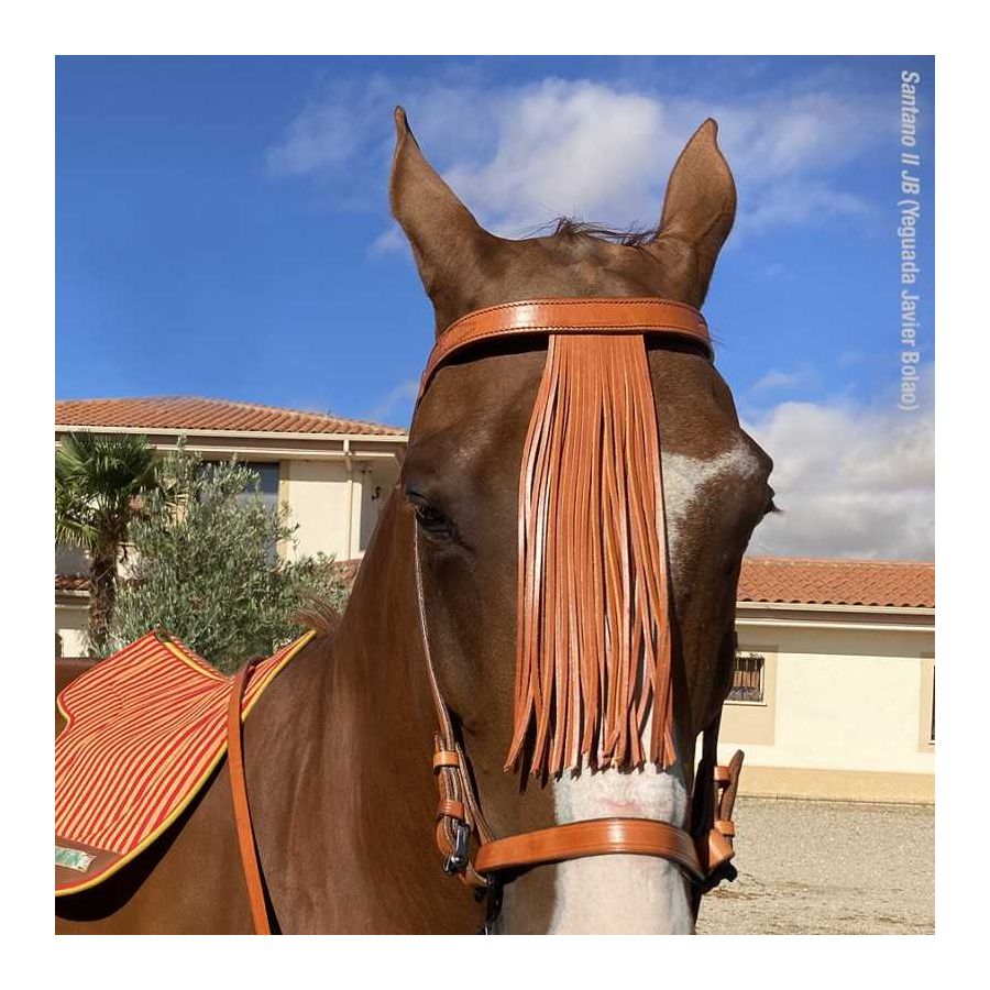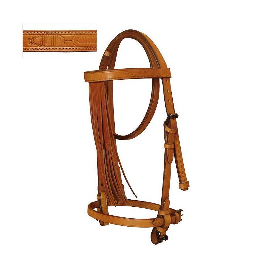 Ισπανικού στυλ χαλινό από εξαιρετικής ποιότητας δέρμα στολισμένο με δερμάτινα κρόσσια και σκαλιστό σχέδιο στο μέτωπο.