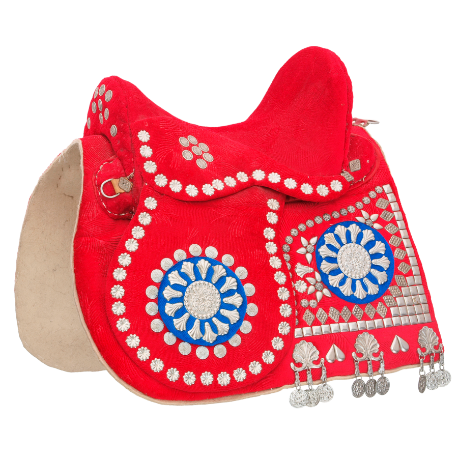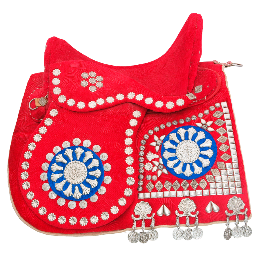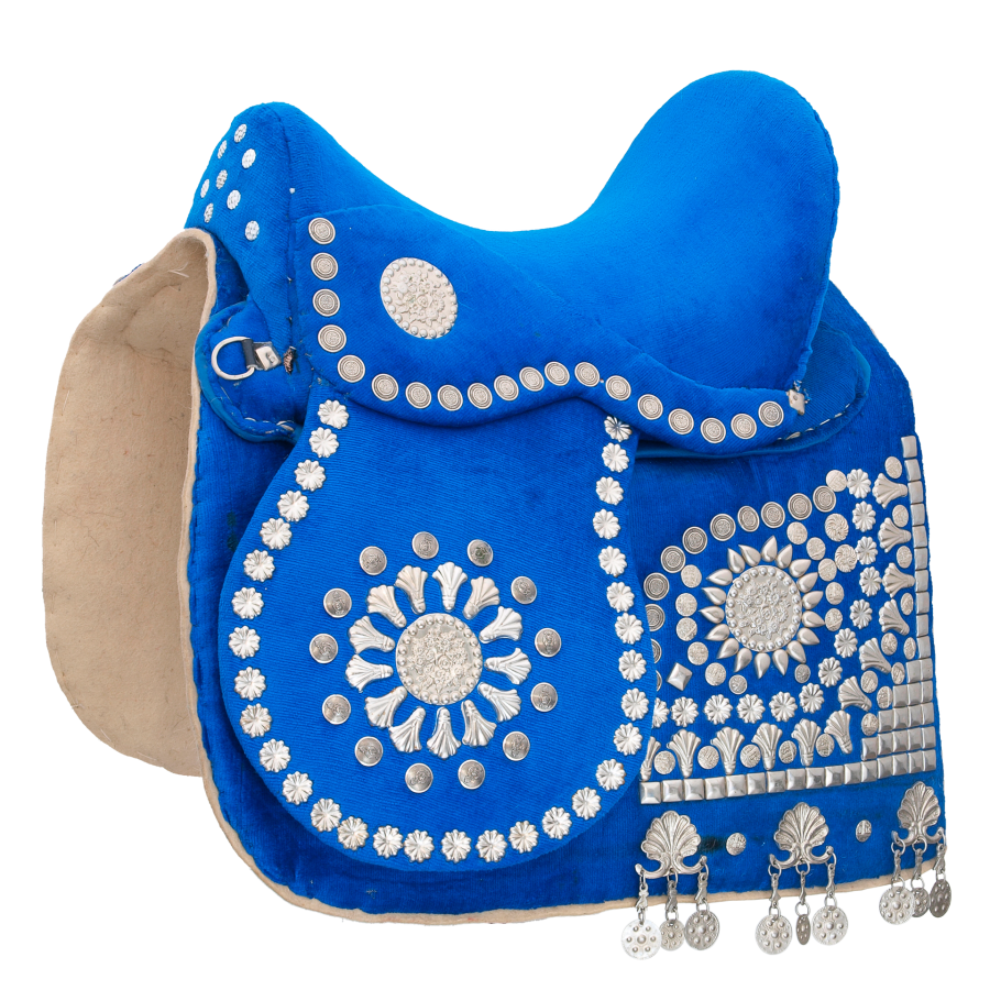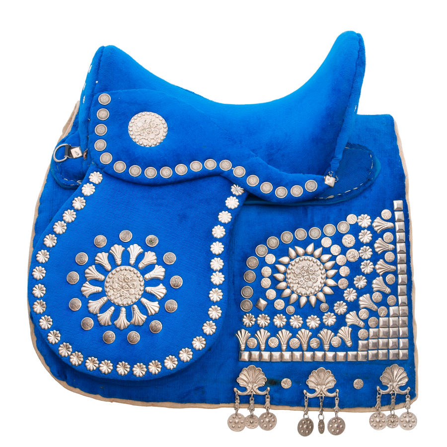 Αιγυπτιακή βελούδινη σέλα σε δύο όμορφους χρωματισμούς είτε για ίππευση είτε για να διακόσμηση. Ιδανική λύση για παρελάσεις και εκθέσεις. Βελούδινη, διακοσμημένη με μεταλλικά μέρη , μαξιλάρια με μάλλινο κετσέ.