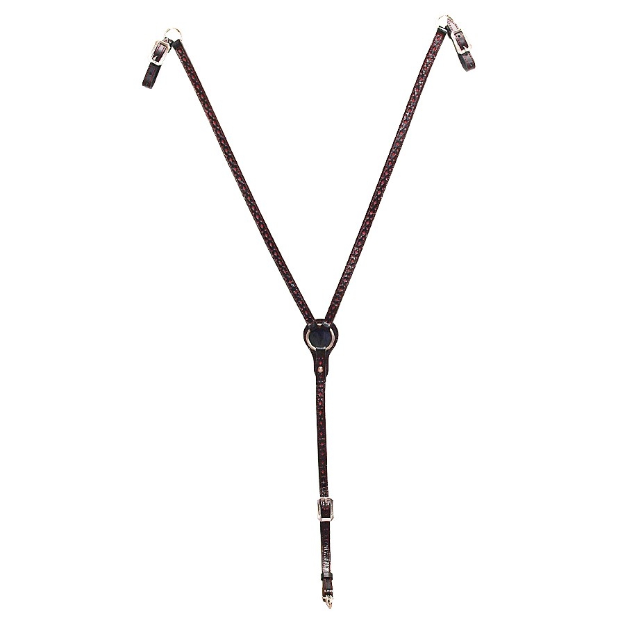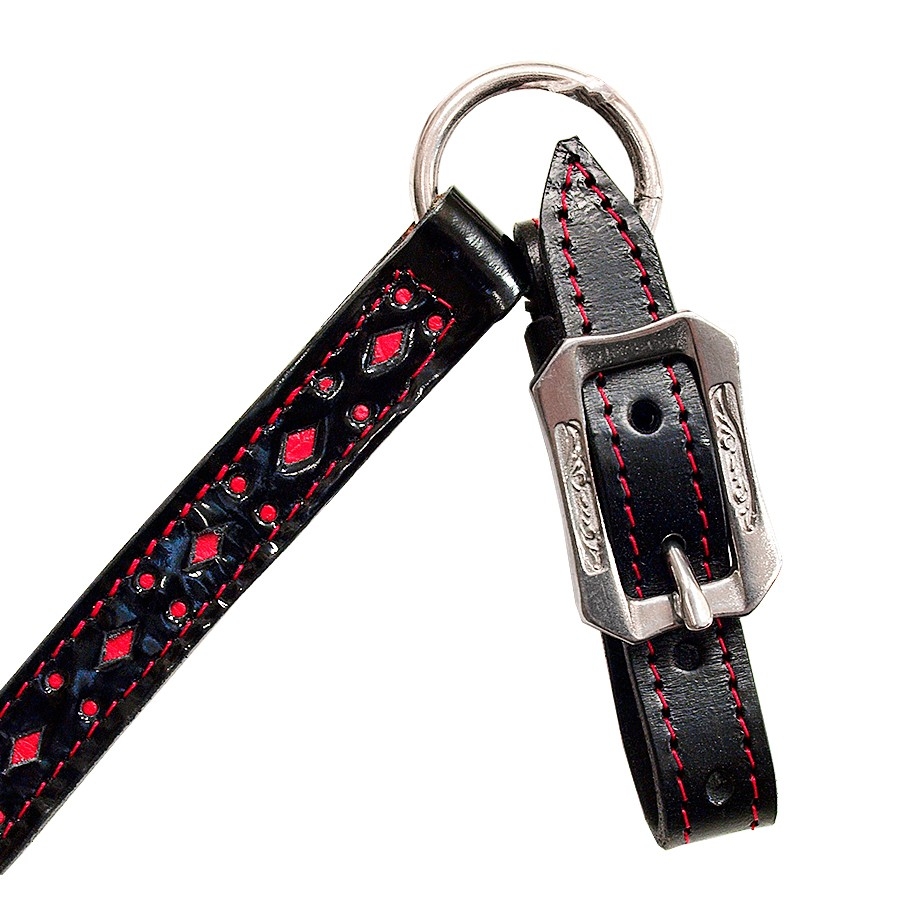 Ισπανικό επιστήθιο κατασκευασμένο από δέρμα μοσχάρι, διακοσμημένο με μαύρο και κόκκινο λουστρίν.