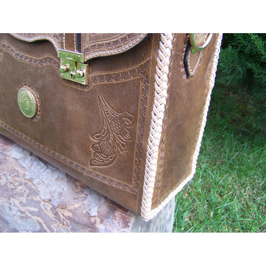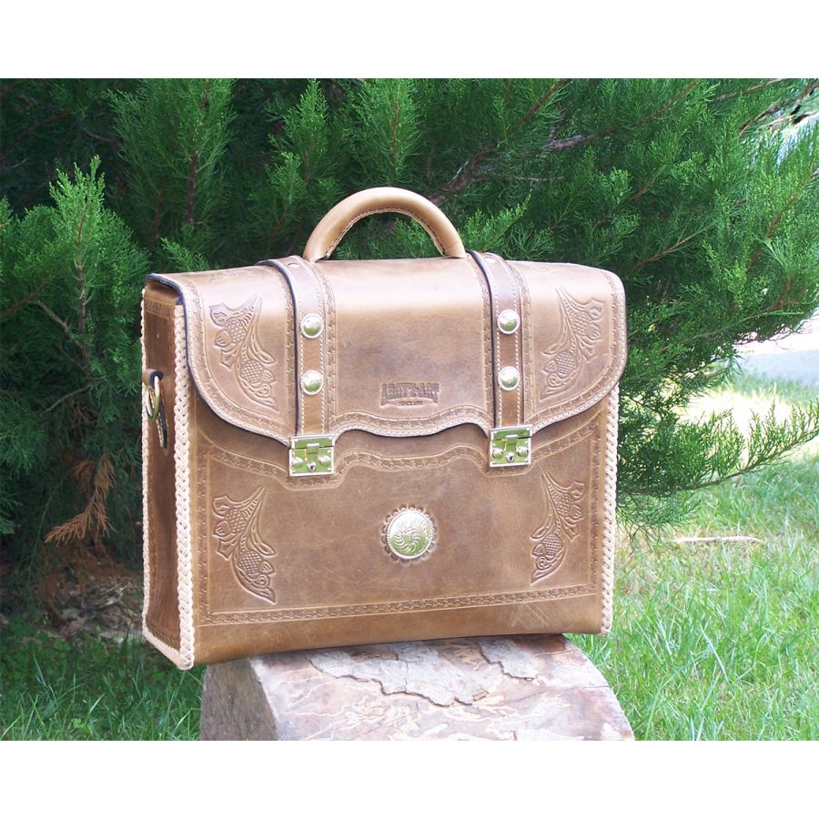 Δερμάτινη τσάντα-χαρτοφύλακας. Κατάλληλη για έγγραφα και φακέλους. Διαθέτει ιμάντα ρυθμιζόμενο & αποσπώμενο για κράτημα στον ώμο, επίσης διαθέτει λαβή χειρός με μαλακή ενίσχυση για άνετο κράτημα στο χέρια. Κλείνει με κούμπωμα. Διαθέτει ενσωματωμένο σύστημα κλειδαριάς στο κούμπωμα και κλειδί.