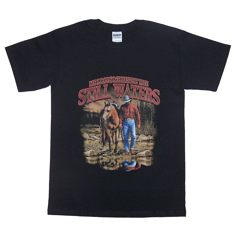 Κοντομάνικο μπλουζάκι western στυλ σε μαύρο φόντο με σταμπαρισμένη εικόνα μοναχικού καβαλάρη που οδηγεί το άλογό του στο νερό.....για διψασμένα πνεύματα!