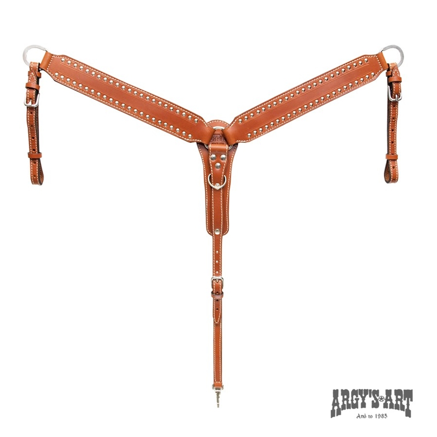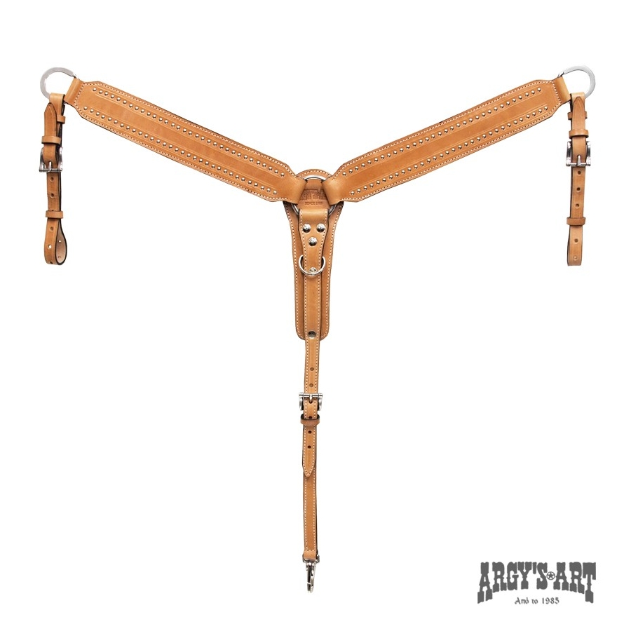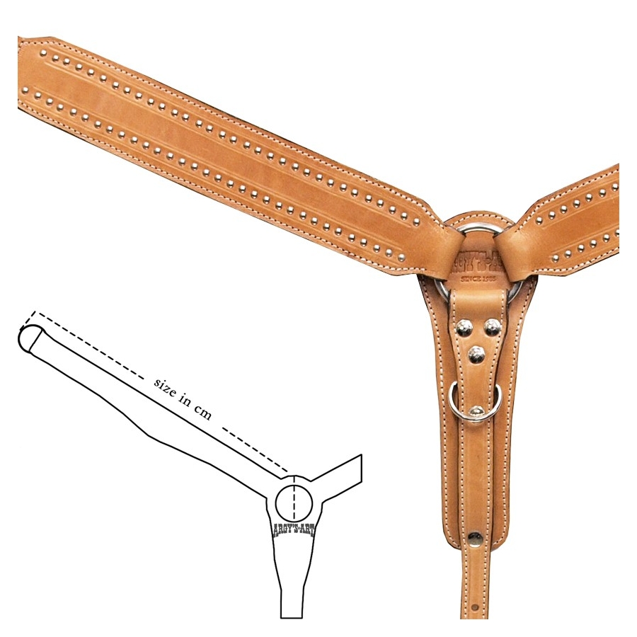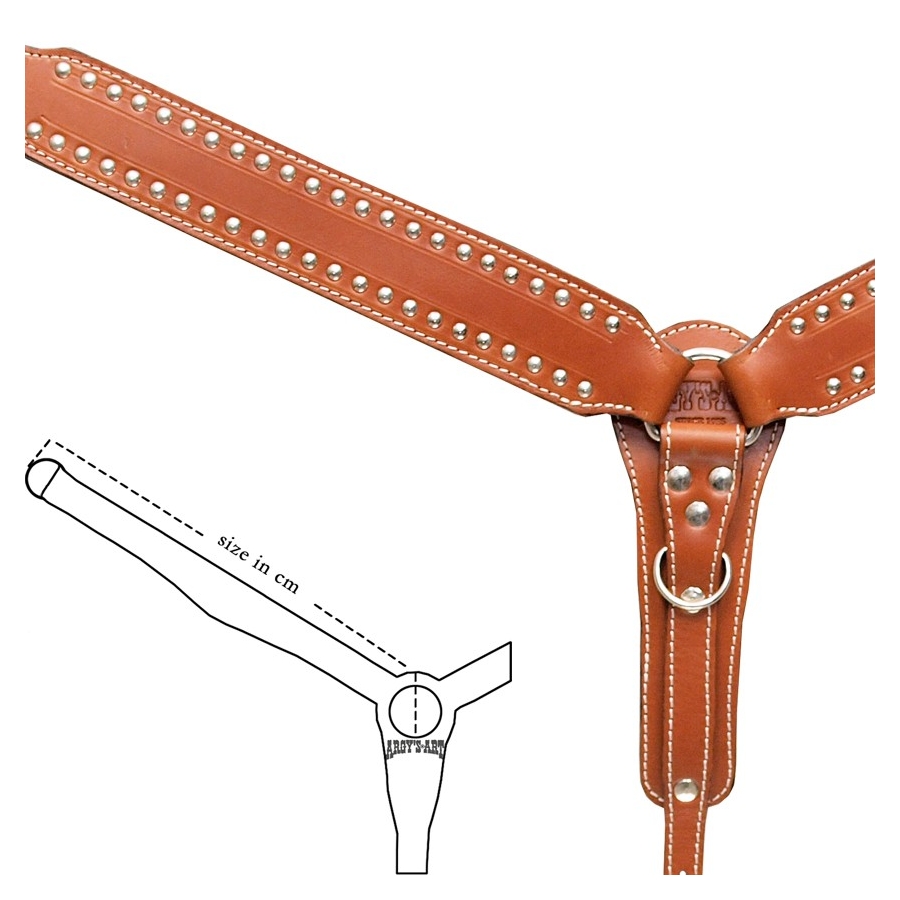 Επιστήθιο, φτιαγμένο στο χέρι, από δέρμα μοσχάρι φυτικής δέψεως πάχους 5mm εξαιρετικής ποιότητας και μεγάλης αντοχής, ενισχυμένους κρίκους και επινικελωμένο γάντζο. Διακοσμημένο με πολλά μικρά μεταλλικά διακοσμητικά.