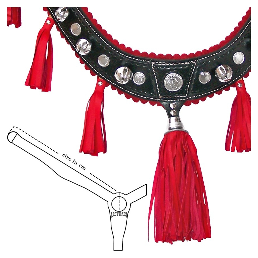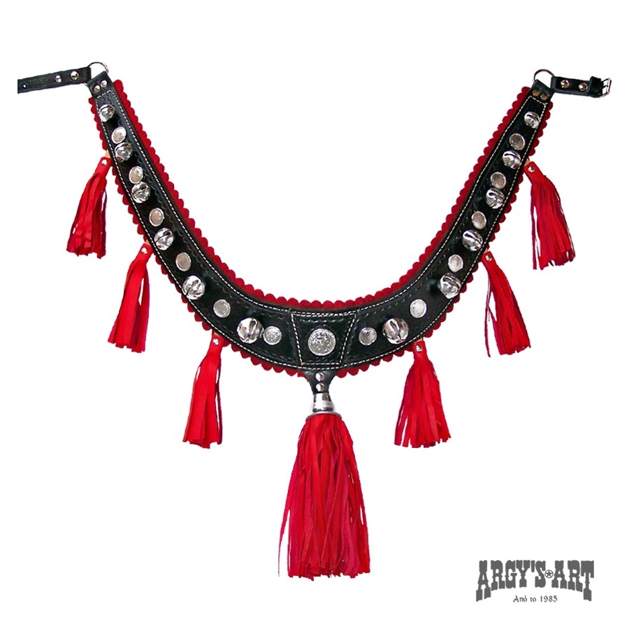 Επιστήθιο western από φυτικό δέρμα μοσχάρι πάχους 5mm. Διακοσμημένο με δερμάτινες φούντες, επιχρωμιωμένα μεταλλικά και κουδούνια άμαξας.