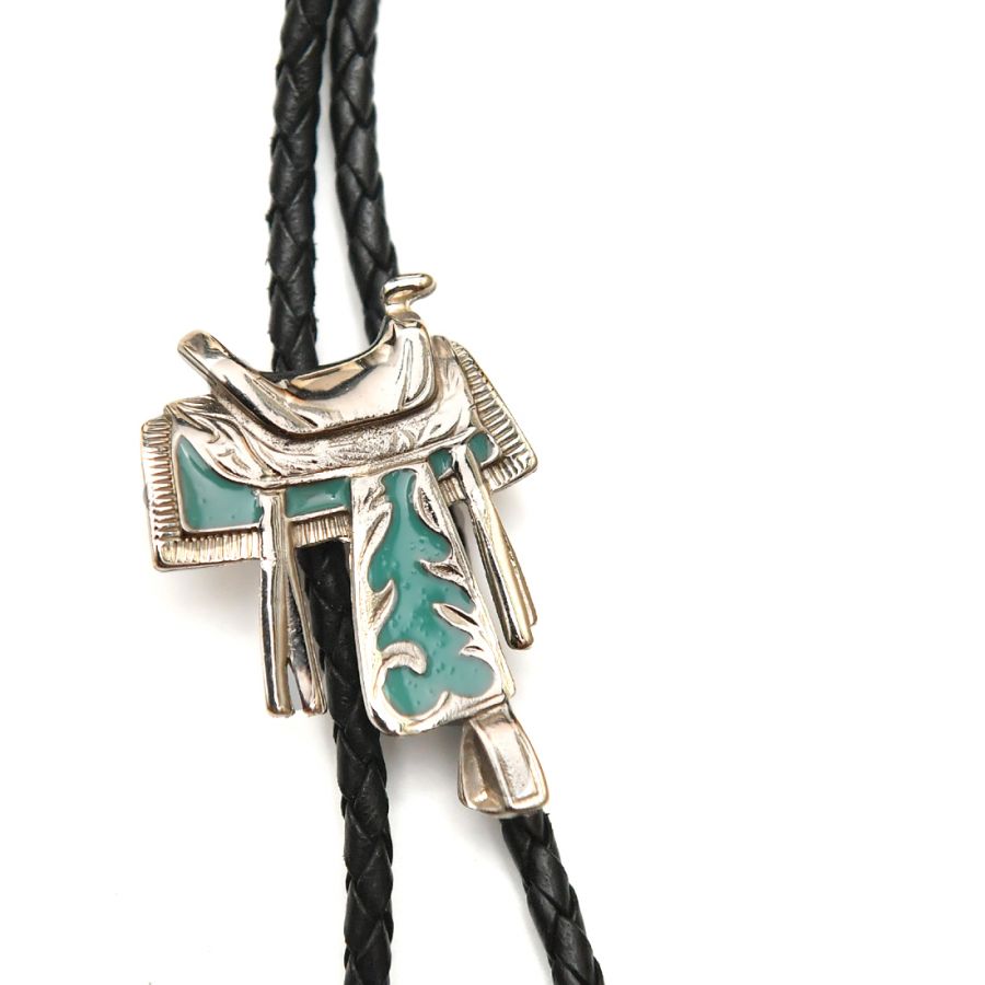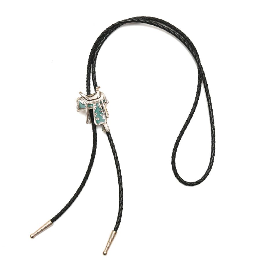 Γραβάτα τύπου Western. Η αγκράφα απεικονίζει σέλα και έχει σμάλτο σε χρώμα τιρκουάζ.