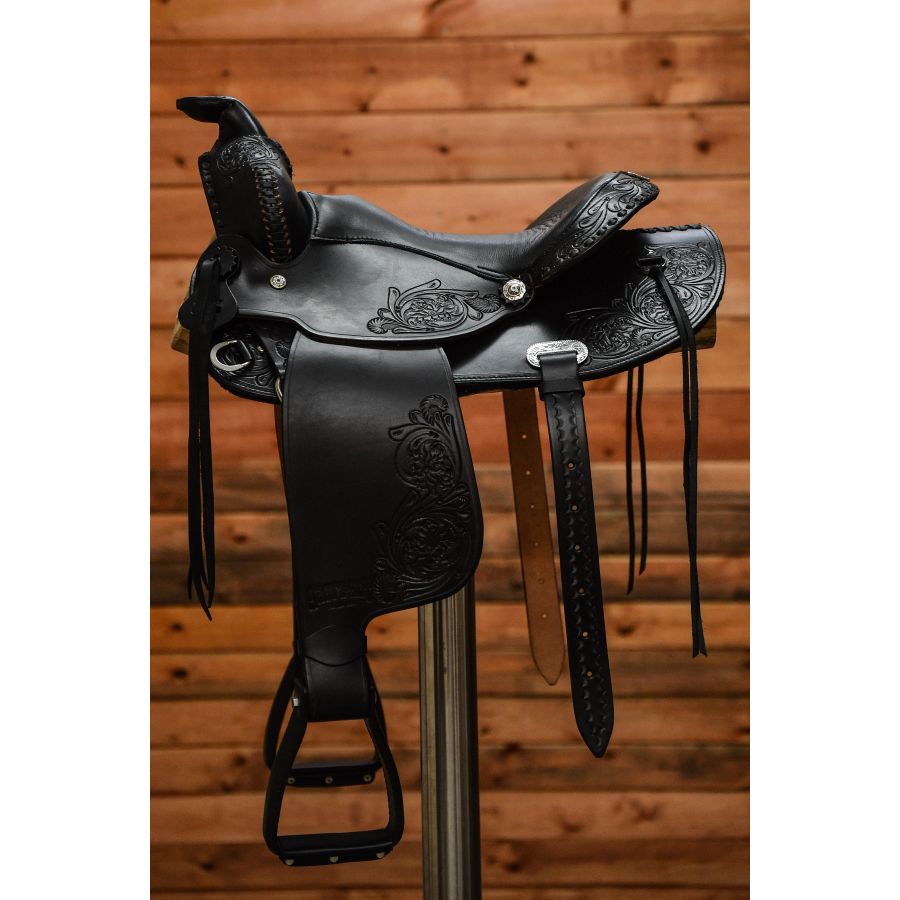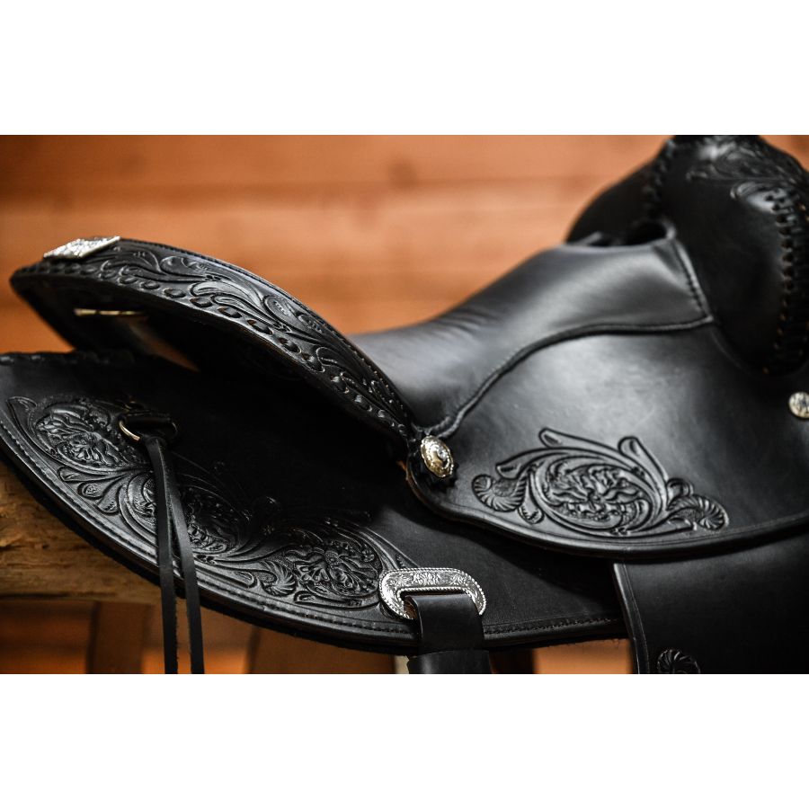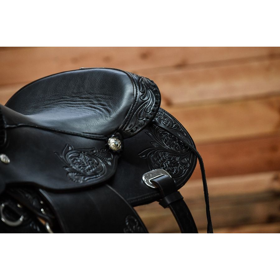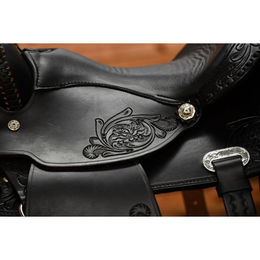 Χειροποίητη σέλα κατασκευασμένη από δέρμα. Σε κλασικό western σχεδιασμό, με κέρατο μπροστά, αναπαυτικό κάθισμα για τον αναβάτη, western αναβολείς, λουριά για πρώτο και δεύτερο έποχο και κρίκους πρόσδεσης για επιστήθιο και υπονούριο.