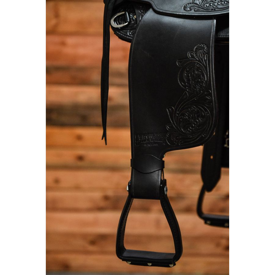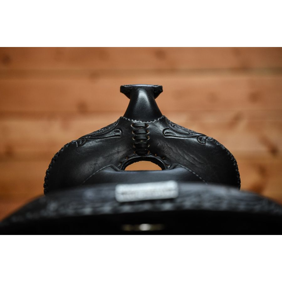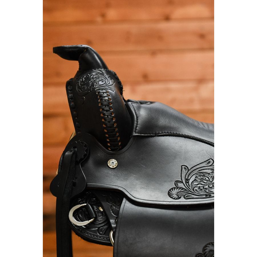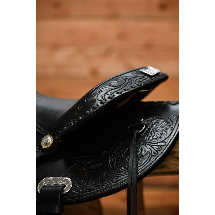Χειροποίητη σέλα κατασκευασμένη από δέρμα. Σε κλασικό western σχεδιασμό, με κέρατο μπροστά, αναπαυτικό κάθισμα για τον αναβάτη, western αναβολείς, λουριά για πρώτο και δεύτερο έποχο και κρίκους πρόσδεσης για επιστήθιο και υπονούριο.