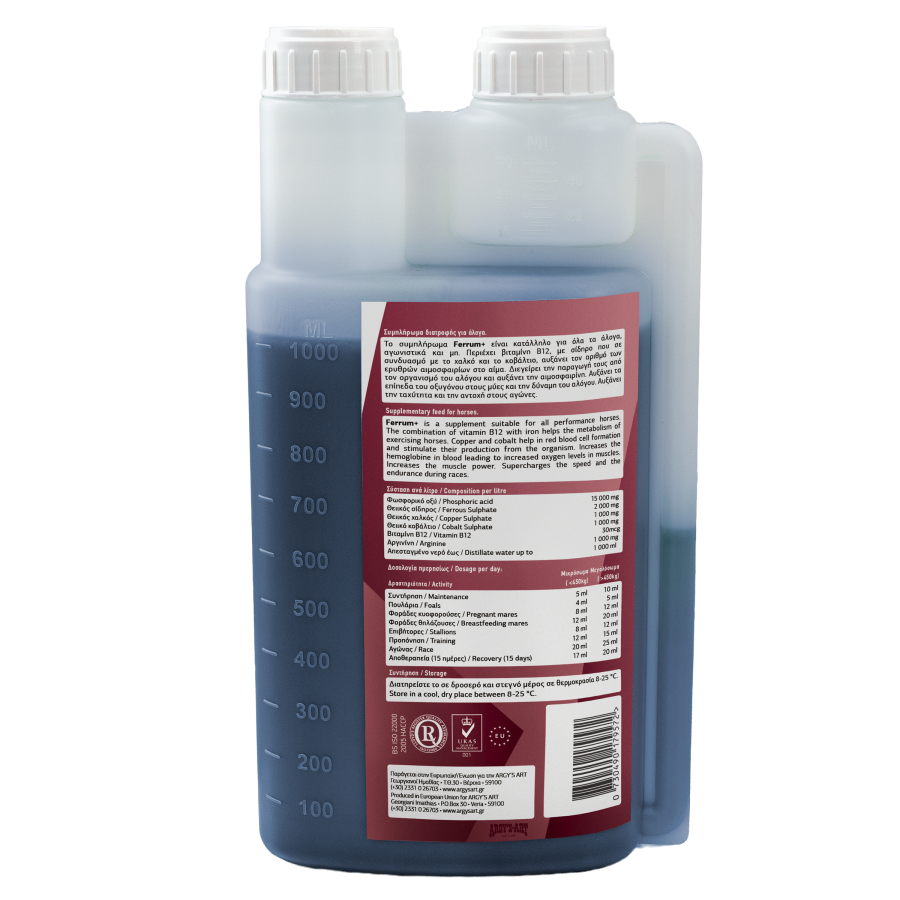 Ferrum + is a supplement suitable for all performance horses. The combination of vitamin B12 with iron helps the metabolism of exercising horses. Copper and cobalt help in red blood cell formation and stimulate their production from the organism.