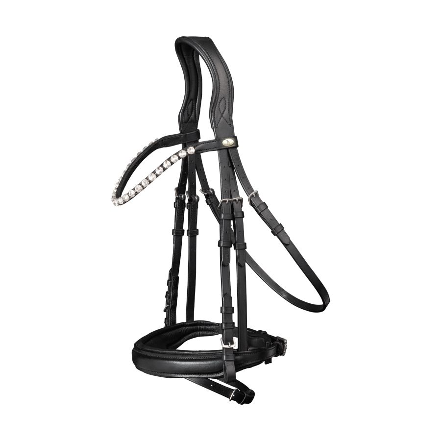 Bridle in modern english line, calf leather, 4mm thick. The headpiece is made of patent leather and is decorated with a series of shiny rhinestones to give your horse a special glow! The noseband is also made of patent leather and has an extra lining of a soft leather pad.