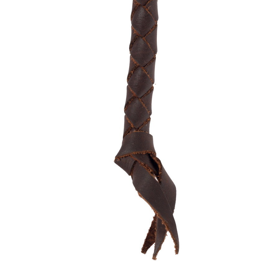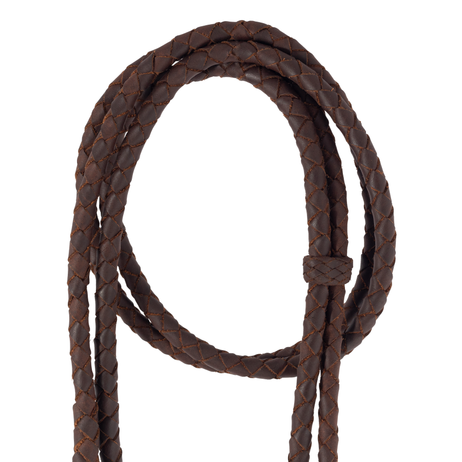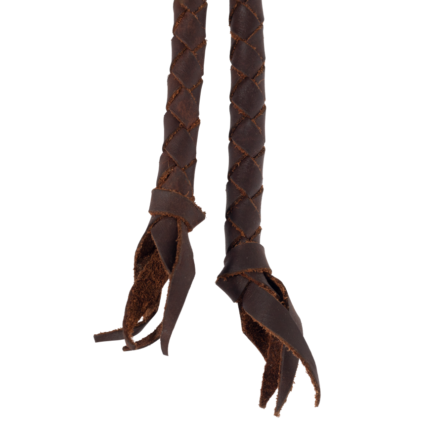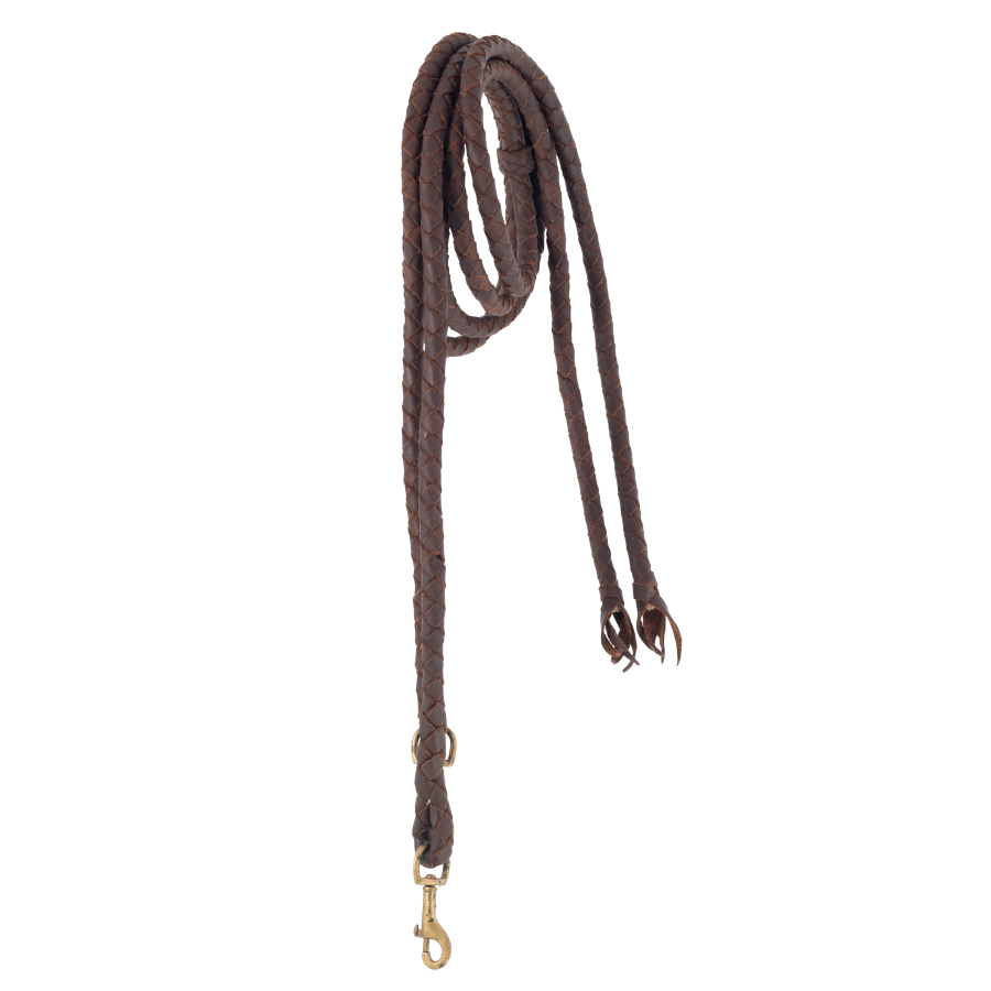 Braided reins, 2 metres, made of high strength natural calf leather with circular braid and joining with bronze safety hooks. They are soft, pleasant to the touch and join together leaving a braided tail.