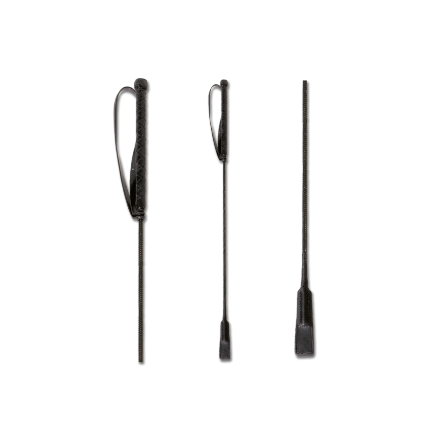 Jumping whip with rubber grip and narrow leather flapper. Also features a wrist loop.