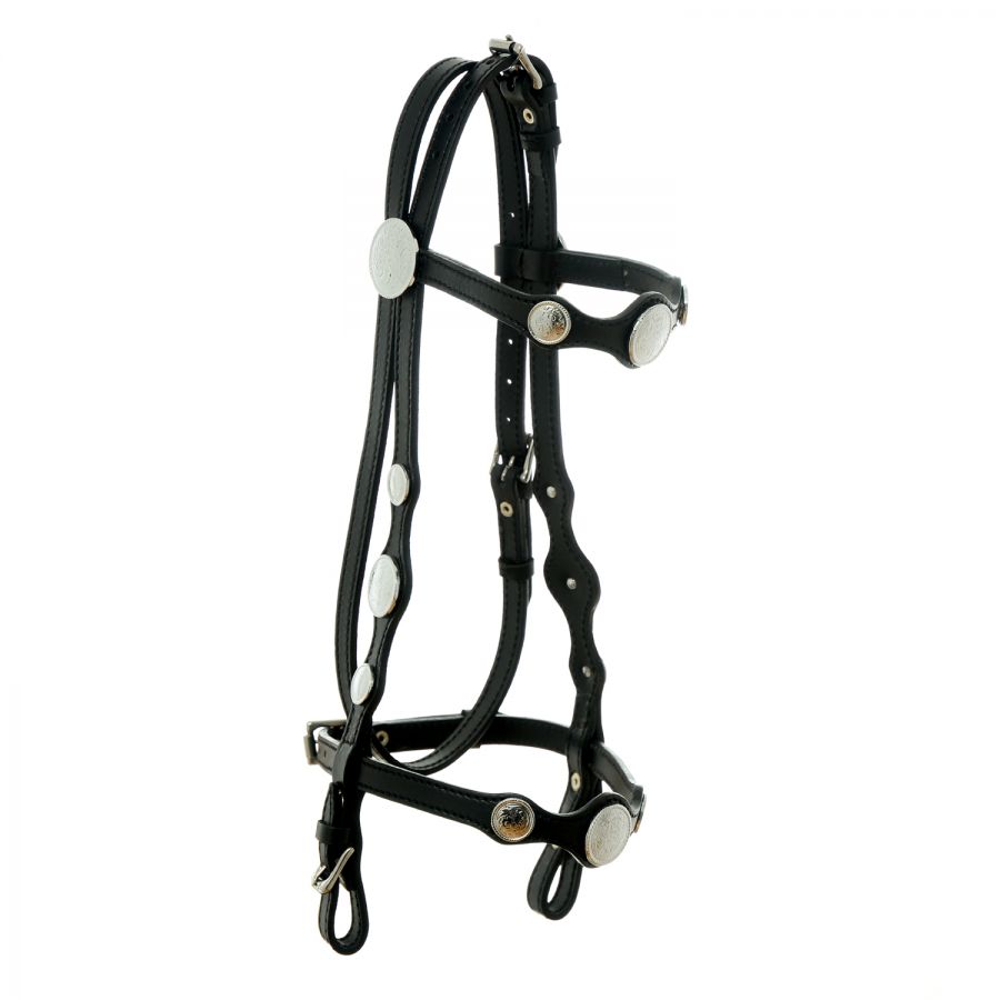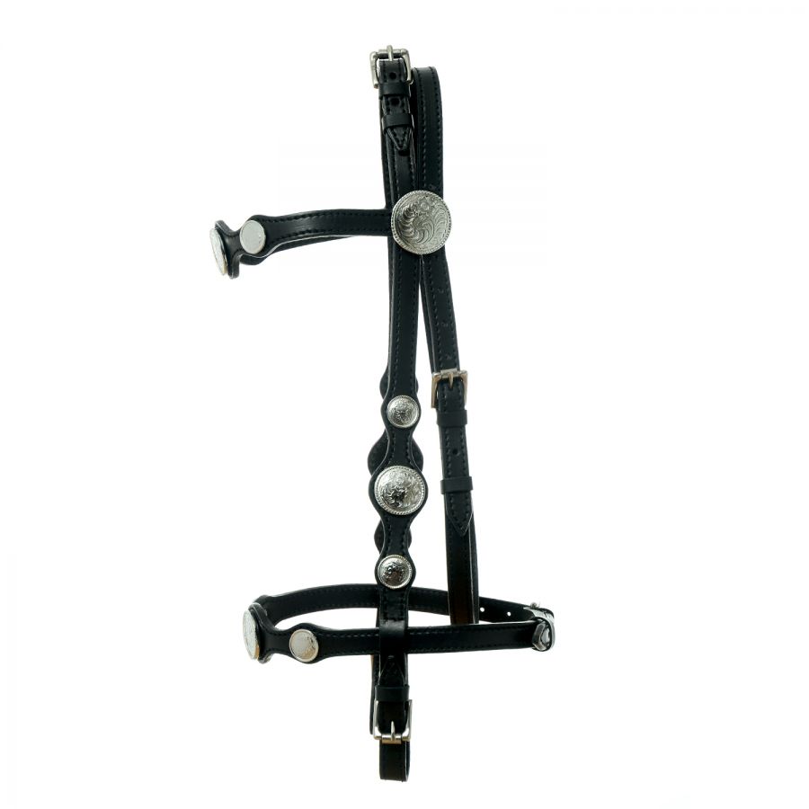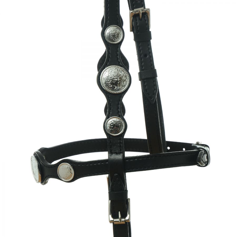 Western bridle made of the best quality calf leather 5 mm thick. Decorated on the browband, noseband and sides with metallic chrome trim and perimeter stitching.